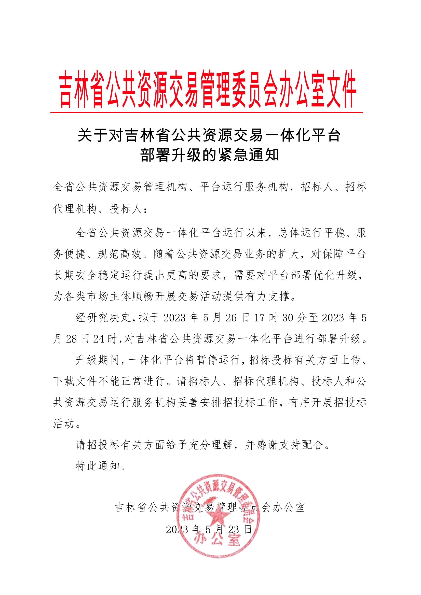 关于对吉林省公共资源交易一体化平台部署升级的紧急通知