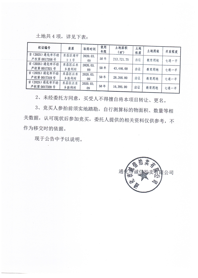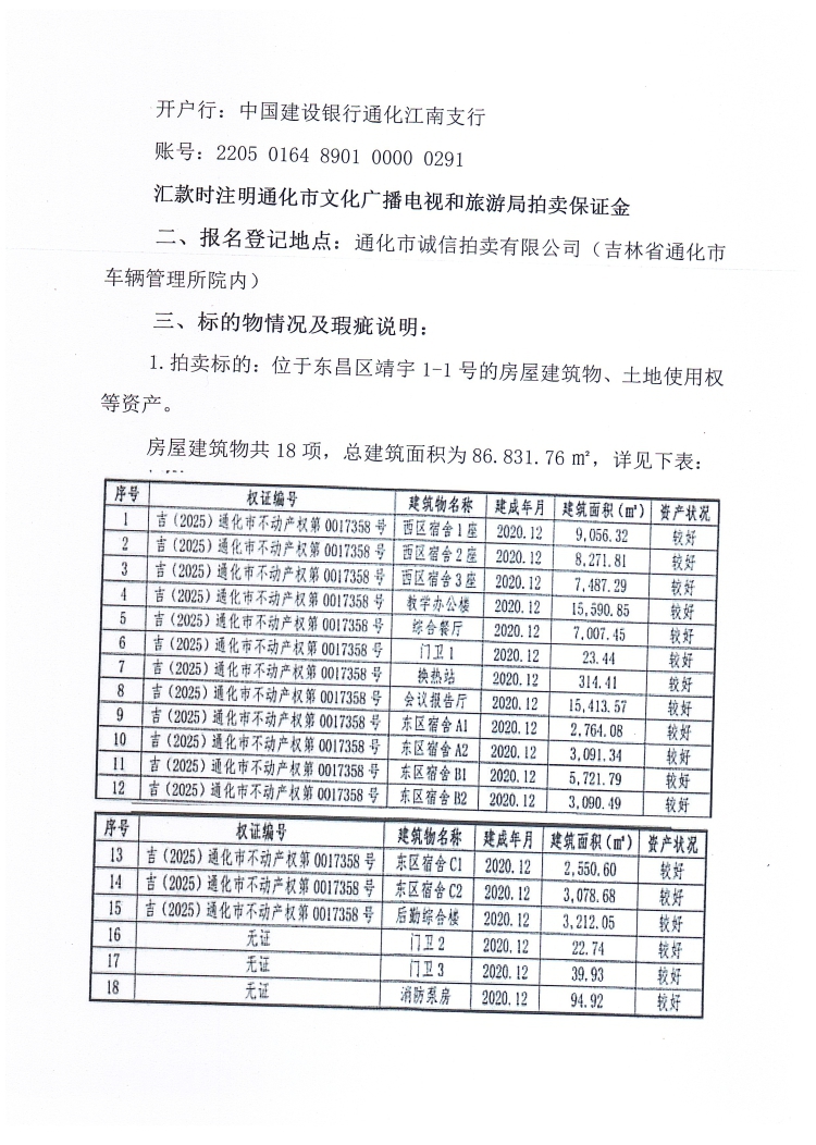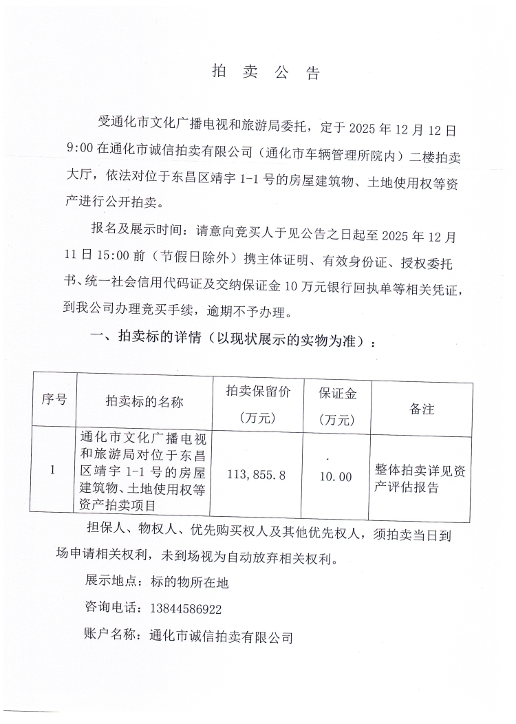 关于通化市文化广播电视和旅游局东昌区靖宇1-1号房屋建筑物、土地使用权等资产拍卖的公示
