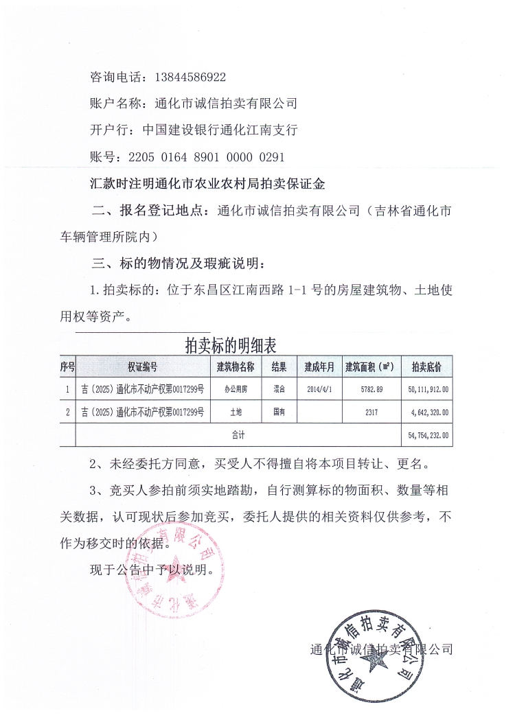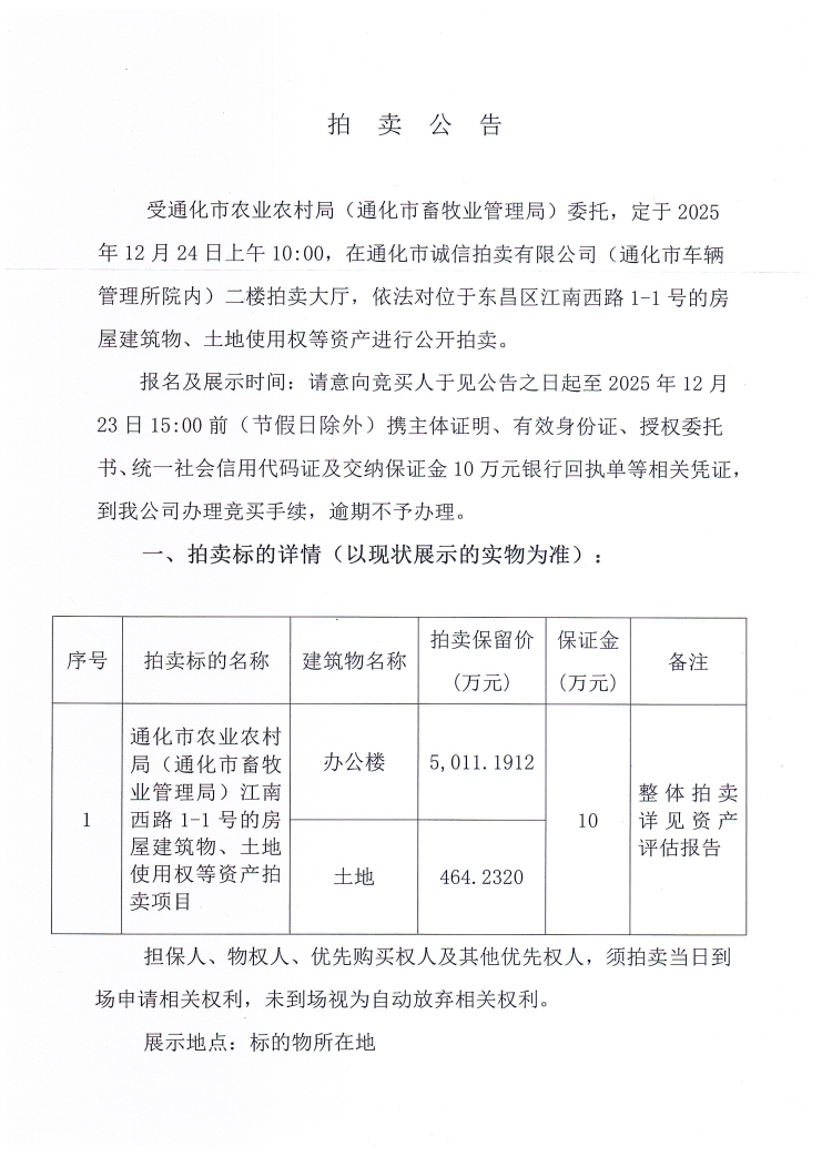 通化市农业农村局(通化市畜牧业管理局)委托拍卖江南西路1-1号的房屋建筑、土地使用权等资产拍卖的公示