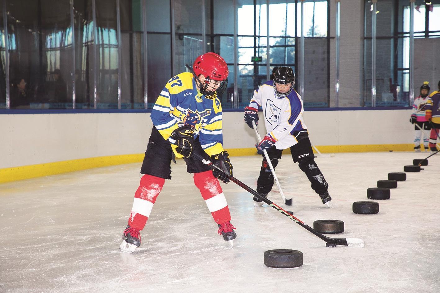 孩子们在公益课堂学冰球。