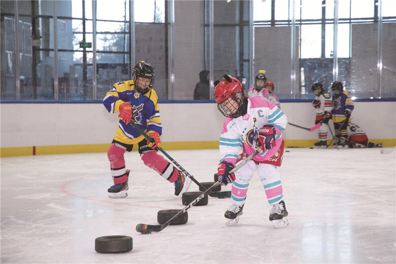 学生在松原市冰上运动中心体验冰雪公益课程。