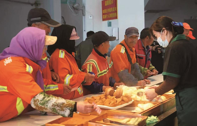 环卫工人在社区食堂排队打饭。