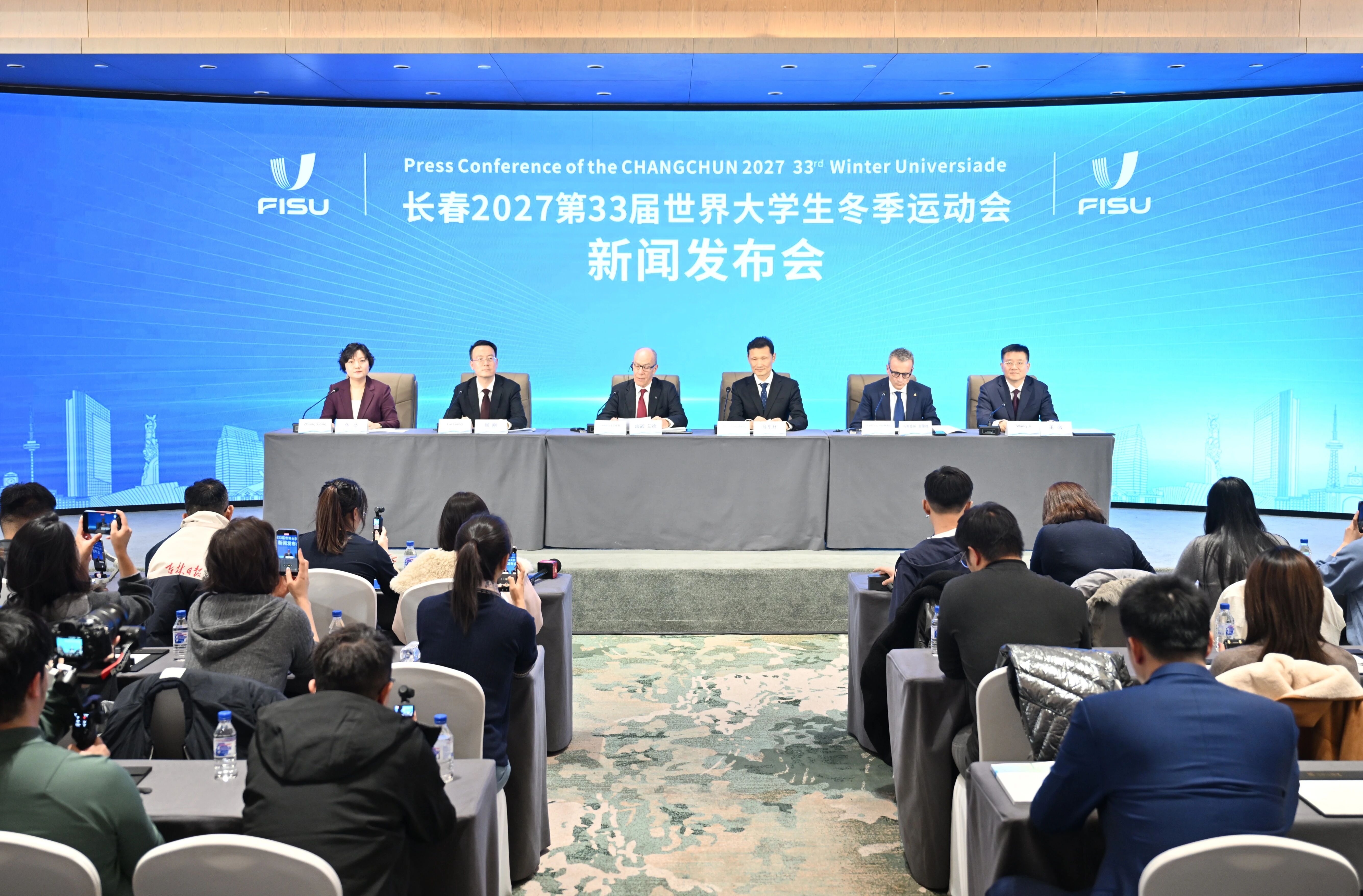 今天我们齐聚于此,是为了与各位分享一个重大喜讯:第33届冬季世界大学生运动会将在中华人民共和国举办!赛事将于2027年1月15日至25日在吉林省长春市举行!